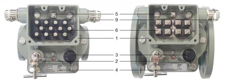頂蓋是由耐氣候變化的鑄鋁合金制成,表層已涂色. 頂蓋部件上部有一個(gè)接線盒(圖4中1),在接線盒前面有一個(gè)放氣閥(圖4中2)和一個(gè)用悶蓋螺母(圖4中3)覆蓋的測(cè)試按鈕,同時(shí)上面還附有一個(gè)測(cè)試按鈕操作說(shuō)明標(biāo)牌(圖4中4). 接線盒中除了有一個(gè)接地點(diǎn)(圖4中5)外,頂蓋底板內(nèi)還裝有電力引線端子(圖4中6). 通過(guò)電力引線端子的數(shù)量可以決定涉及干簧管類型與數(shù)量的開(kāi)關(guān)系統(tǒng)的布線配置.